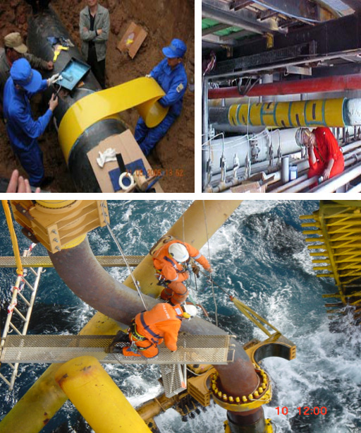 潮間區(qū)立管最易受到海水的浸蝕,采用傳統(tǒng)修復(fù)補(bǔ)焊、換管等工藝需要大量的物質(zhì)和人員配合,還需要?jiǎng)踊鹩绊懮a(chǎn)。而采用MKT-8復(fù)合管道修復(fù)技術(shù)修復(fù),只需要2名材料安裝人員,在不影響生產(chǎn)作業(yè)的情況下在較短時(shí)間內(nèi)就能完成整個(gè)修復(fù)作業(yè)工作。并且經(jīng)過(guò)培訓(xùn)的水下作業(yè)人員可以很容易的潛入海下,對(duì)海下管道進(jìn)行修復(fù)作業(yè),因?yàn)槲夜具x用的特種材料具有直接應(yīng)用于水下的特殊能力。在國(guó)外的平臺(tái)管道修復(fù)有著豐富的工程案例。